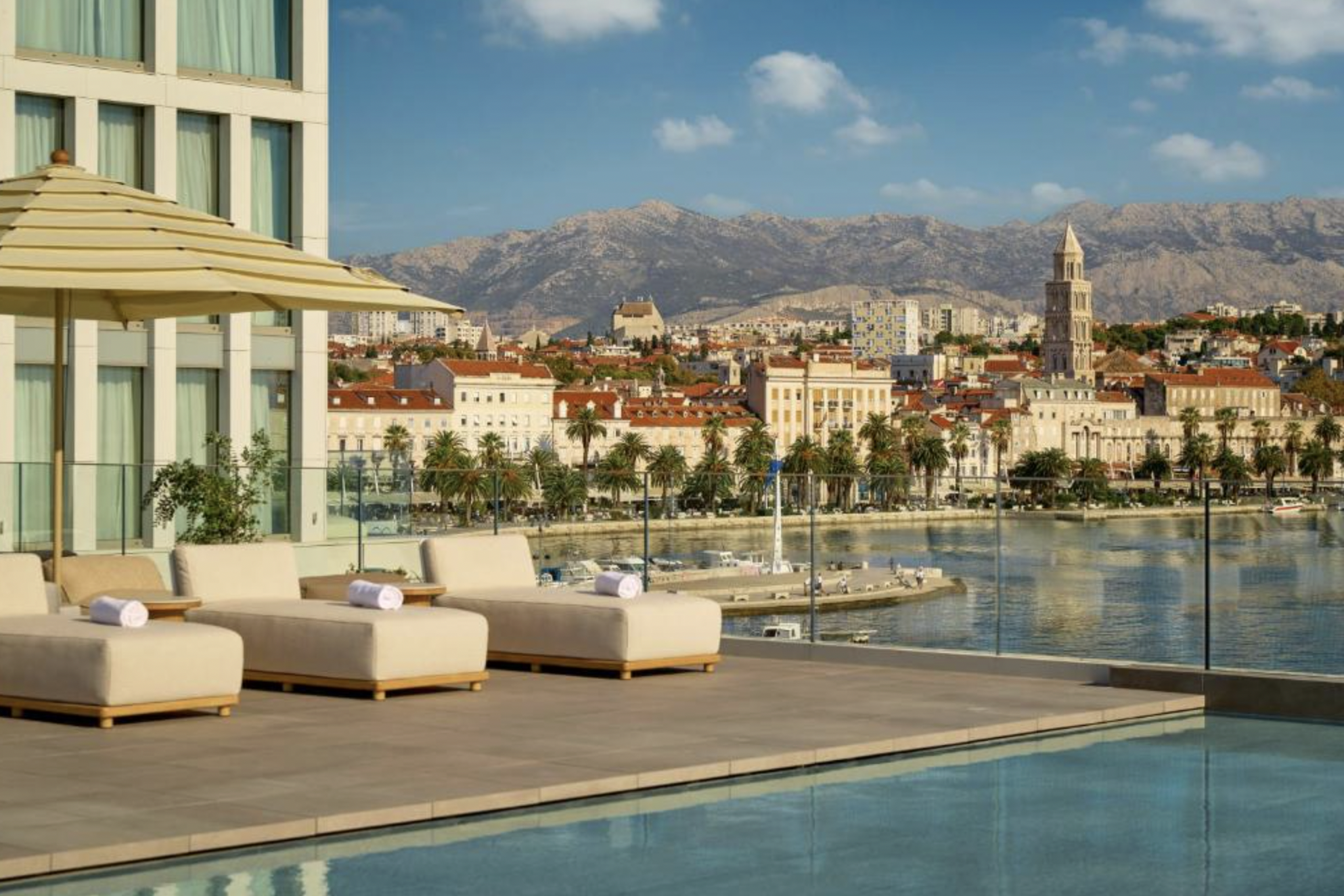 Set along Split’s iconic Riva promenade, Hotel Ambasador blends modern sophistication with Adriatic charm. Every detail, from the sleek design to the sweeping sea views, feels crafted for laid-back luxury. Spend your mornings on the rooftop terrace watching boats glide into the harbor, or unwind by the infinity pool with a glass of local wine in hand. Just steps from the Old Town and Diocletian’s Palace, it’s the perfect balance of city energy and coastal ease, your elegant home base in the heart of Split.
